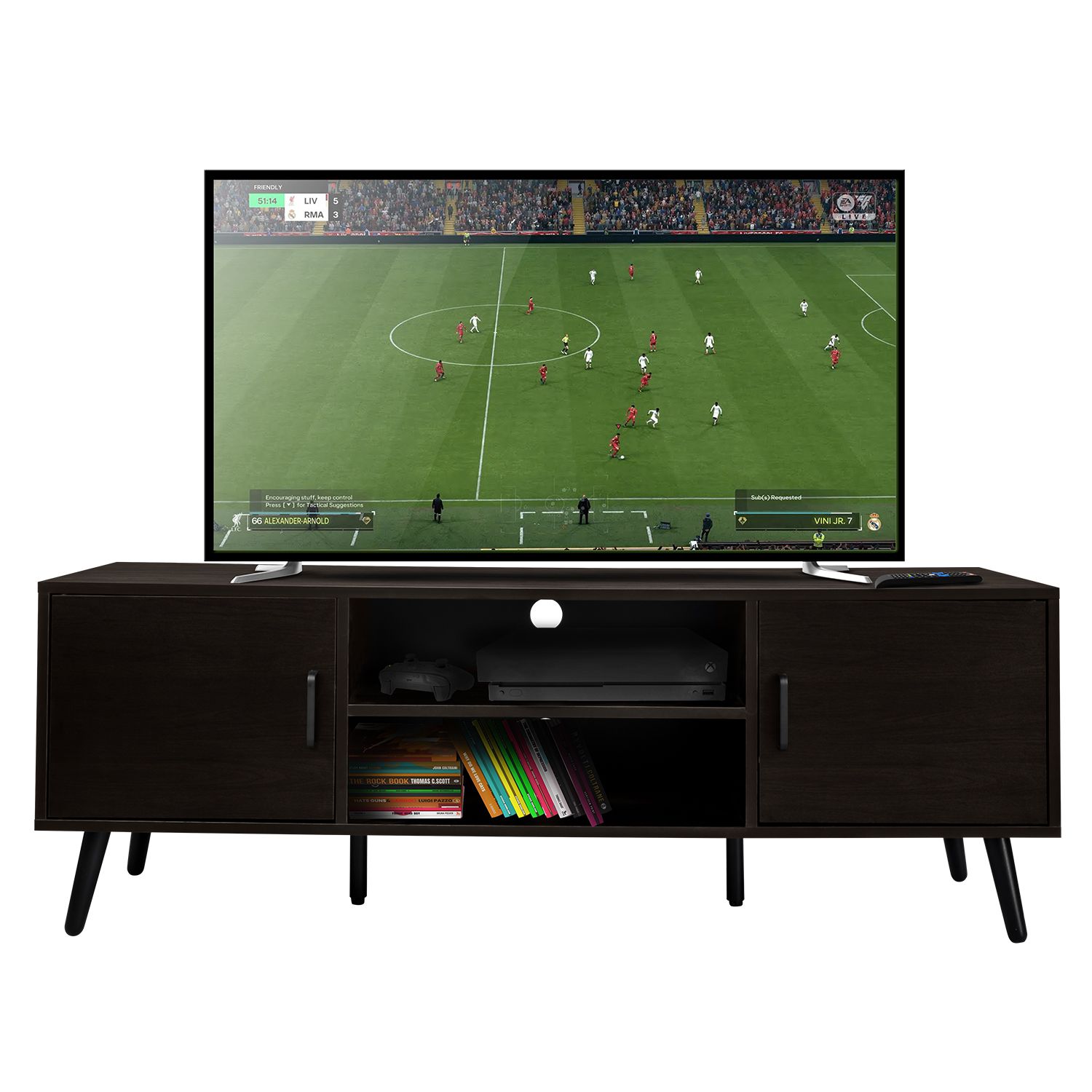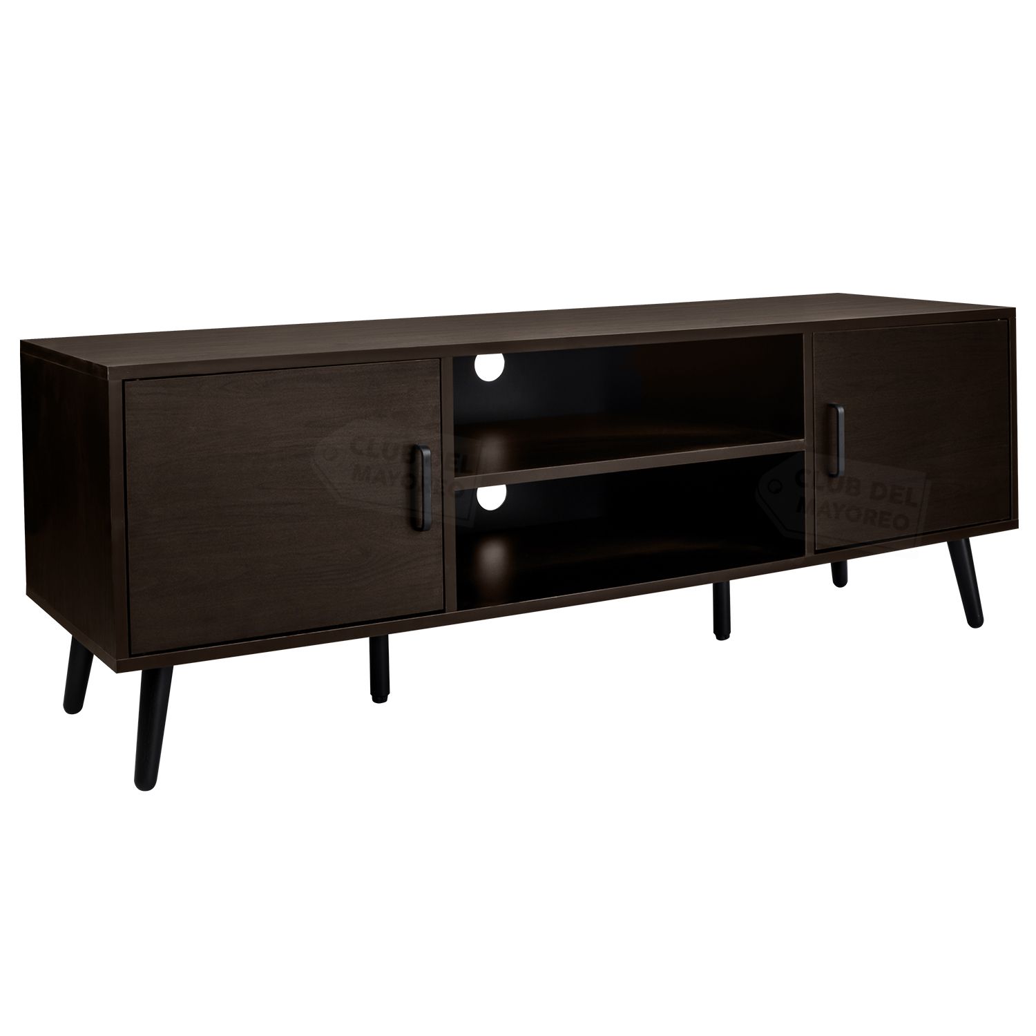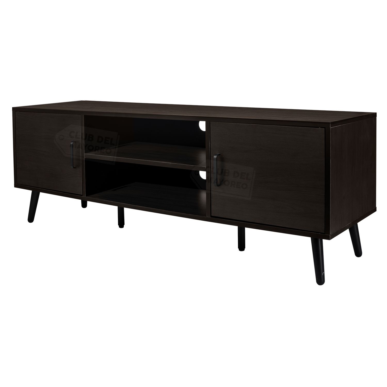 Organiza tu entretenimiento y dale un plus y aspecto a tu hogar. Moderno mueble para television con dos entrepaños centrales y dos puertas laterales frontales para ahorrar espacio o mantener una sala de entretenimiento ordenanda. Cuenta con dos orificios posteriores pasa cables para conectar todos tus equipos sin cables a la vista. Fabricado en madera industrializada con melamina color nuez oscuro. Es resistente puede soportar una televisión de hasta 55 pulgadas.
