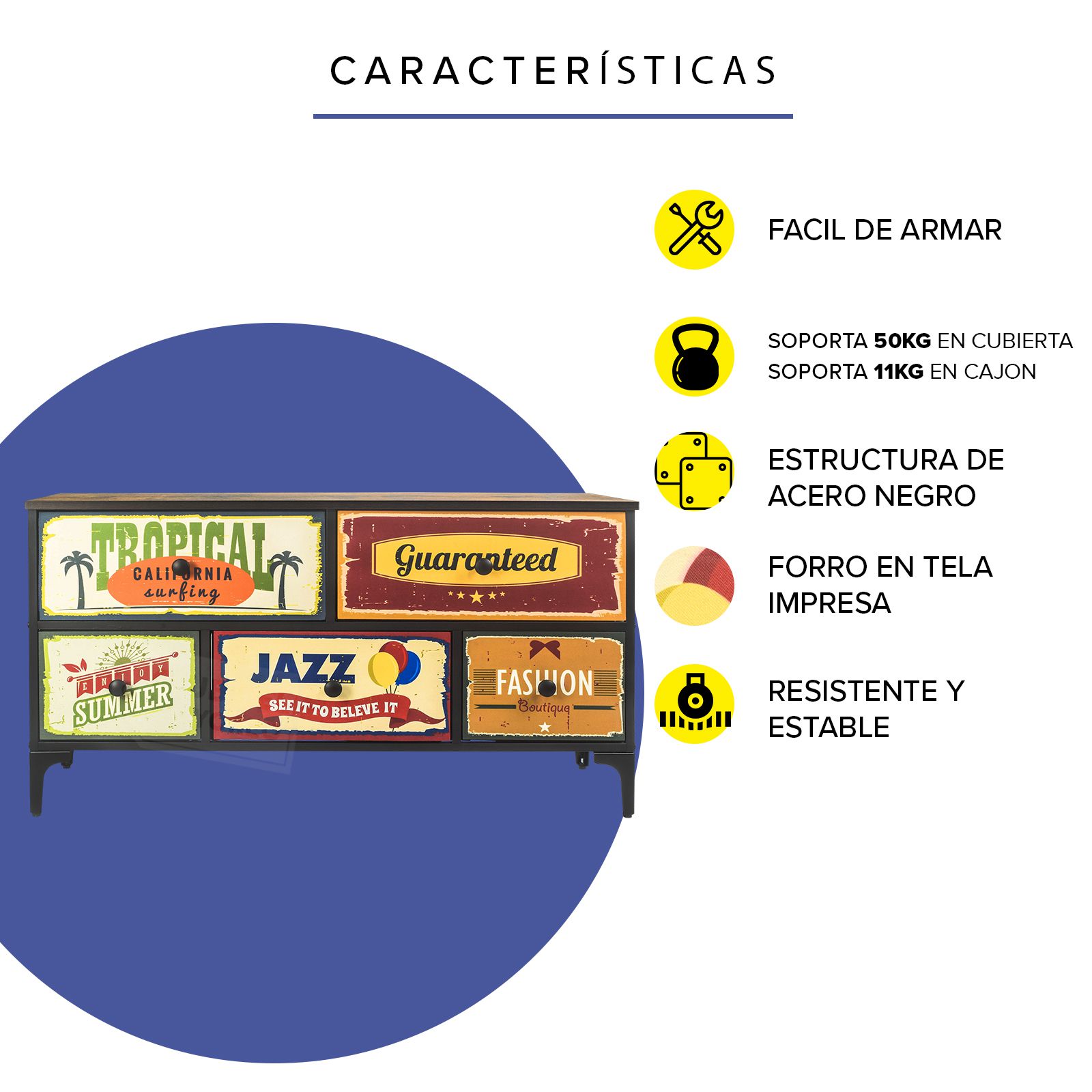 Moderno mueble para televisión de la coleccion New York con cinco cajones en tela impresa diseño diferente para cada uno, interior con tapas en MDF y tela no tejida color negro. Fabricado con estructura metálica resistente y repisa superior en madera industrializada con melamina tipo madera roble. Ideal para combinar con cualquier ambiente de tu recámara. Puede soportar hasta 75 kg en la repisa y entre 8 y 15 Kg en cada cajon. Fácil de armar en solo 20 minutos.