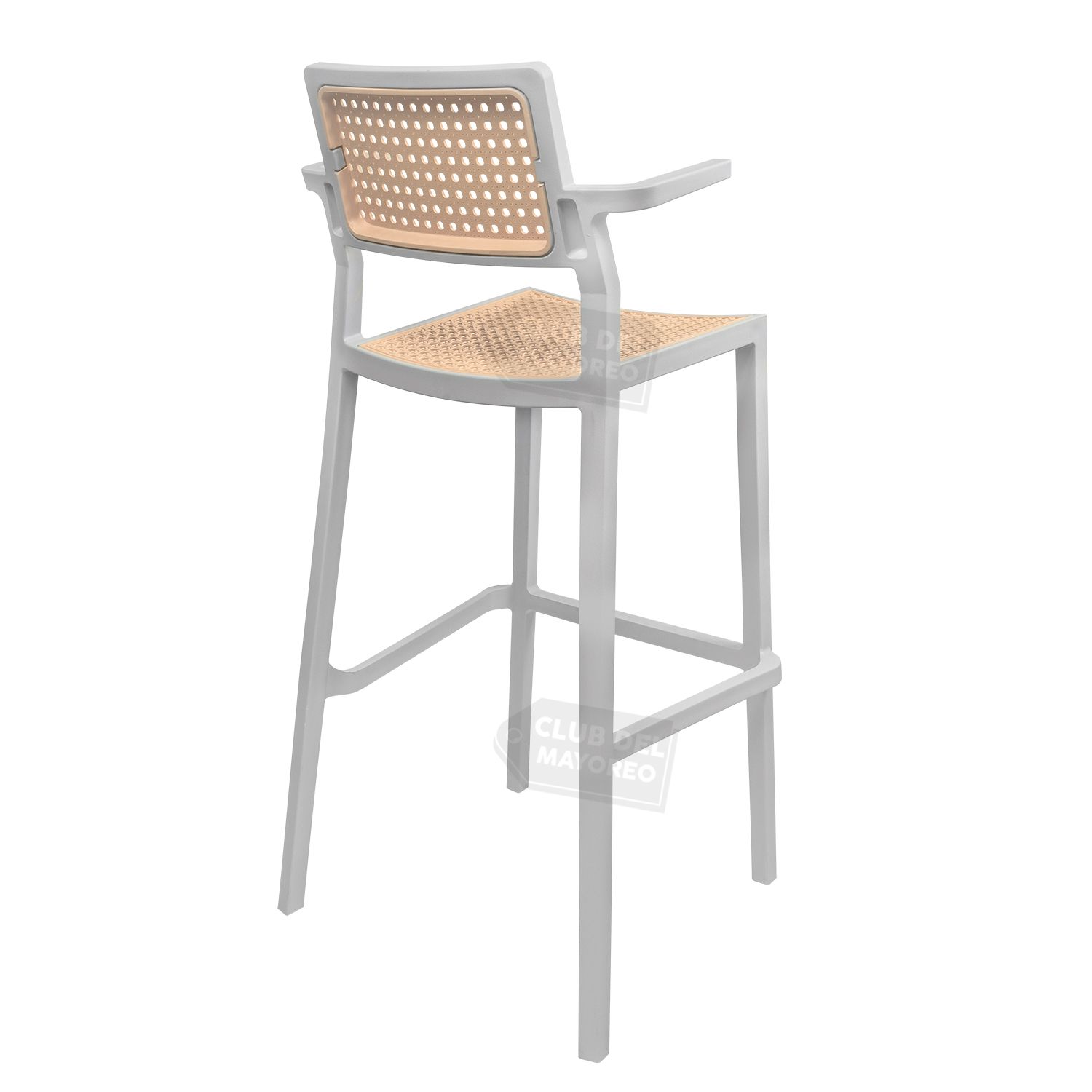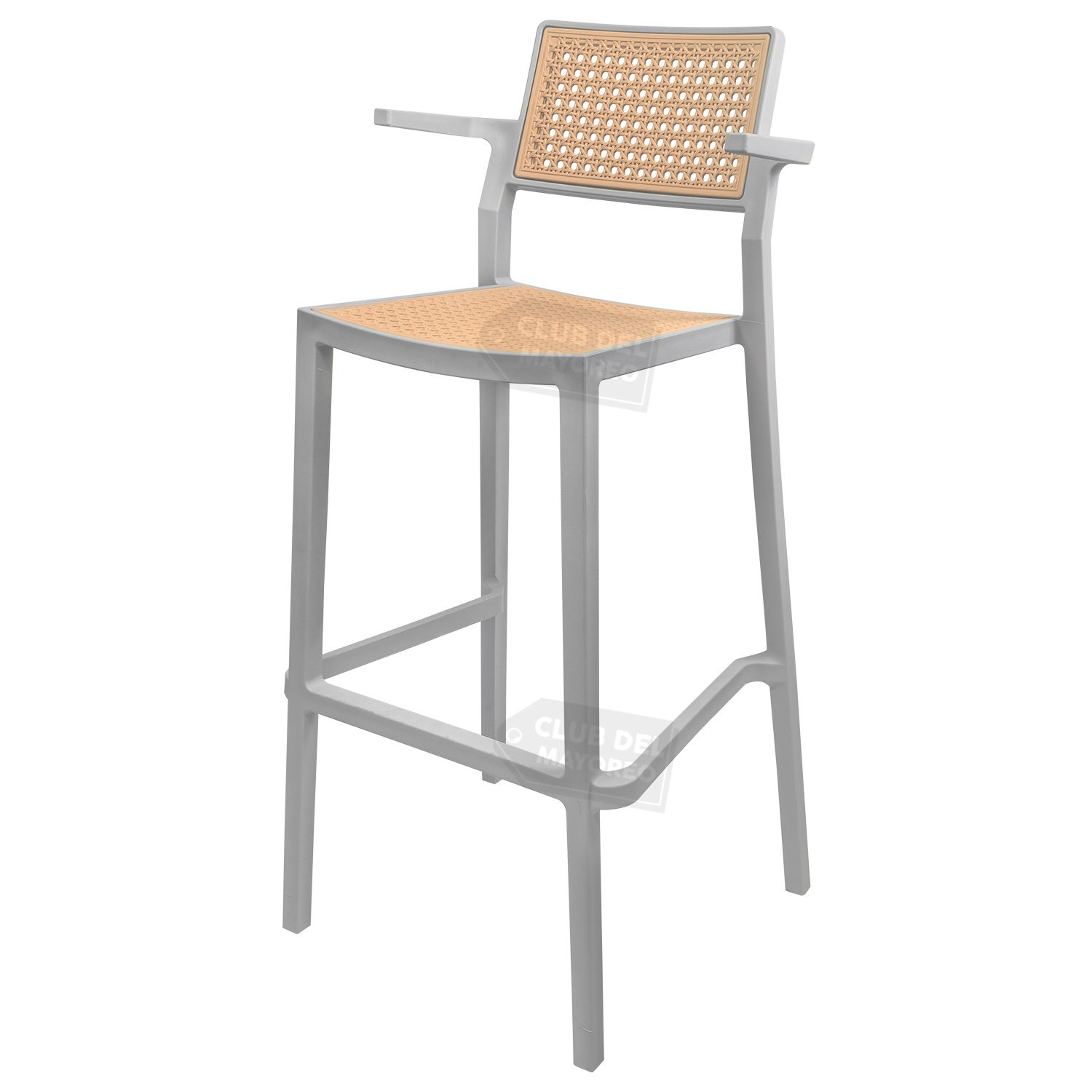 Banco alto con descansa brazos pequeños para barra, bar, restaurante, comidas, etc. Estilo moderno minimalista color gris y asiento con respaldo moldeado semi curvo estilizado ratan para mayor comodidad. Estructura en polimero resistente a golpes, caidas, etc, puede soportar un peso de hasta 130 kg.