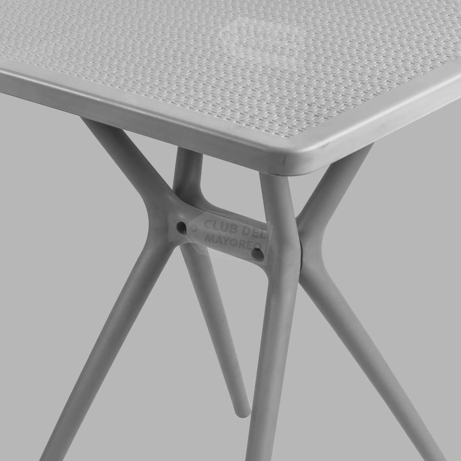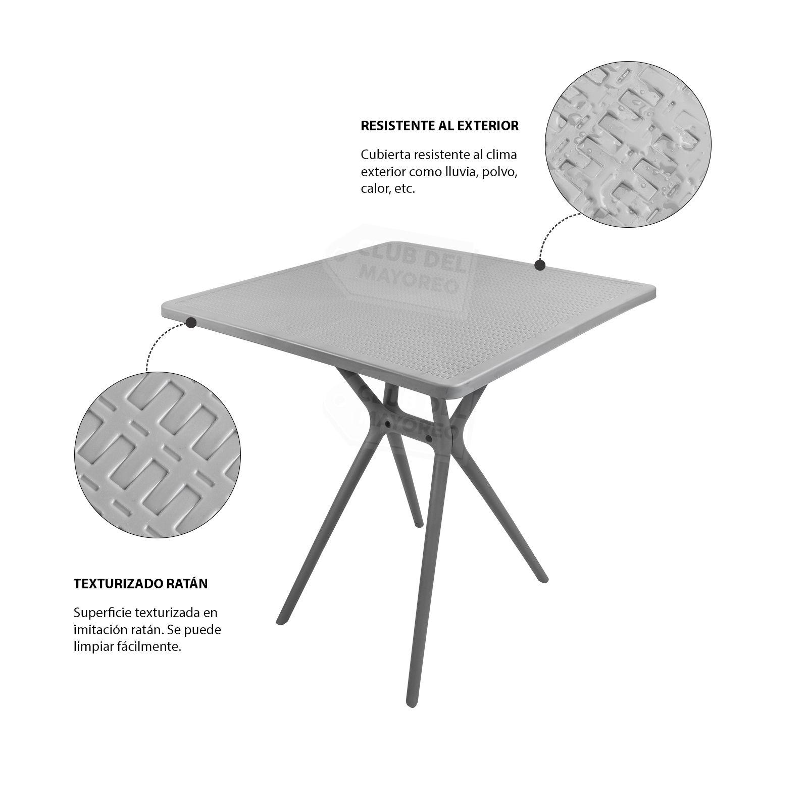 Mesa cuadrada de 70 x 70 cm en color gris para exterior como patios, terrazas, albercas, restaurantes, bar, etc. Construida en plástico resistente al exterior con superficie con texturizado ratán. Es fácil de armar en solo 20 minutos.