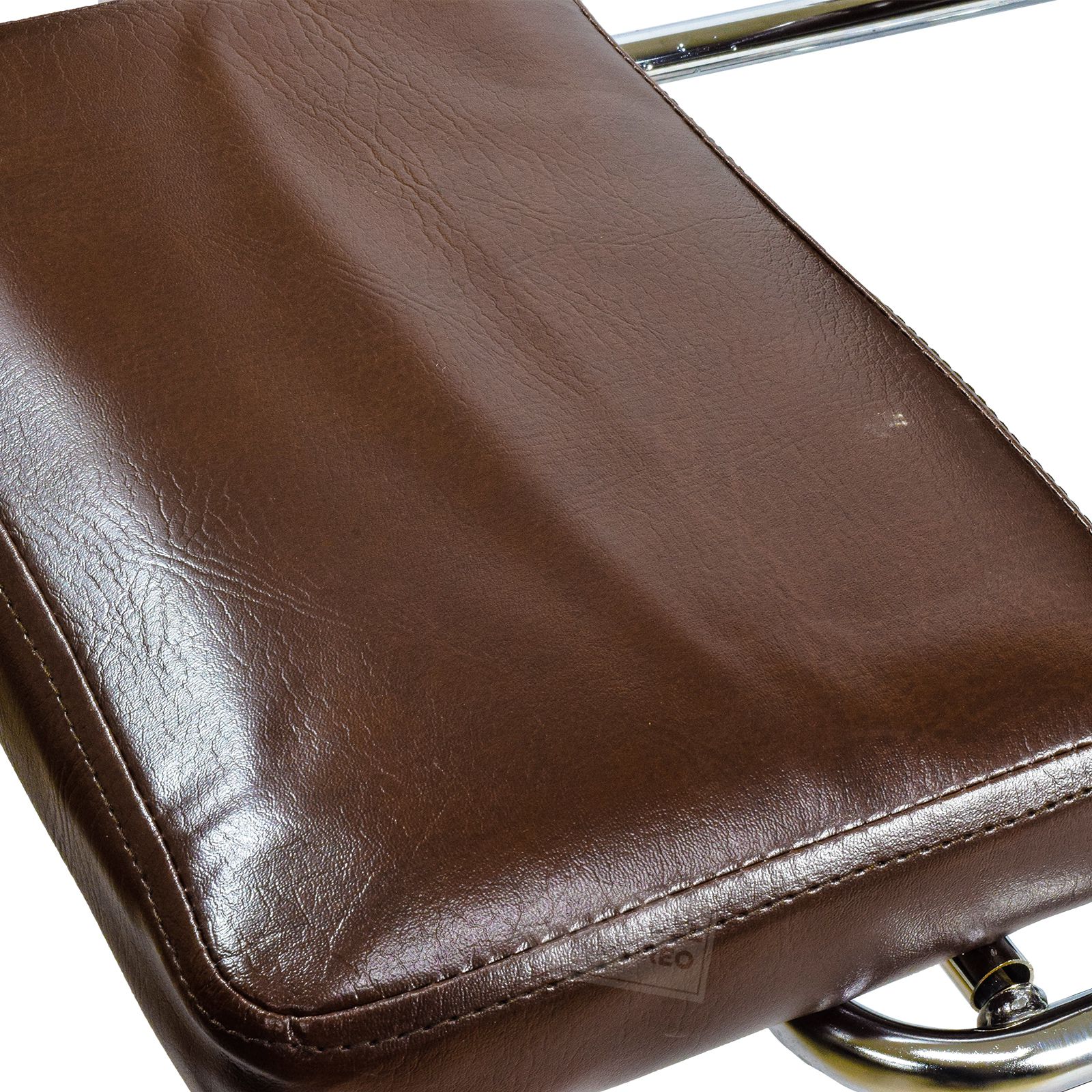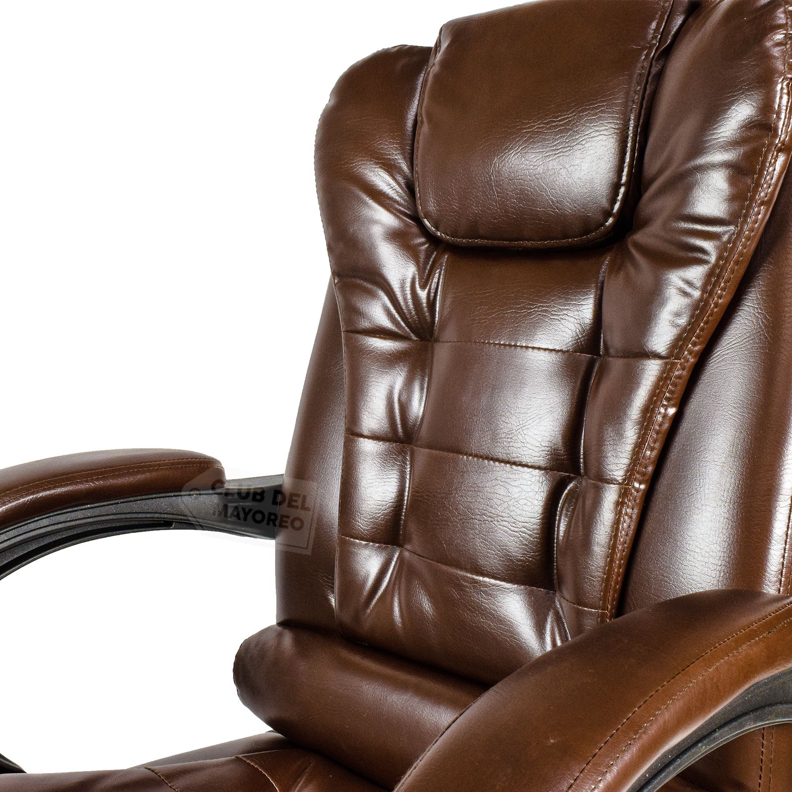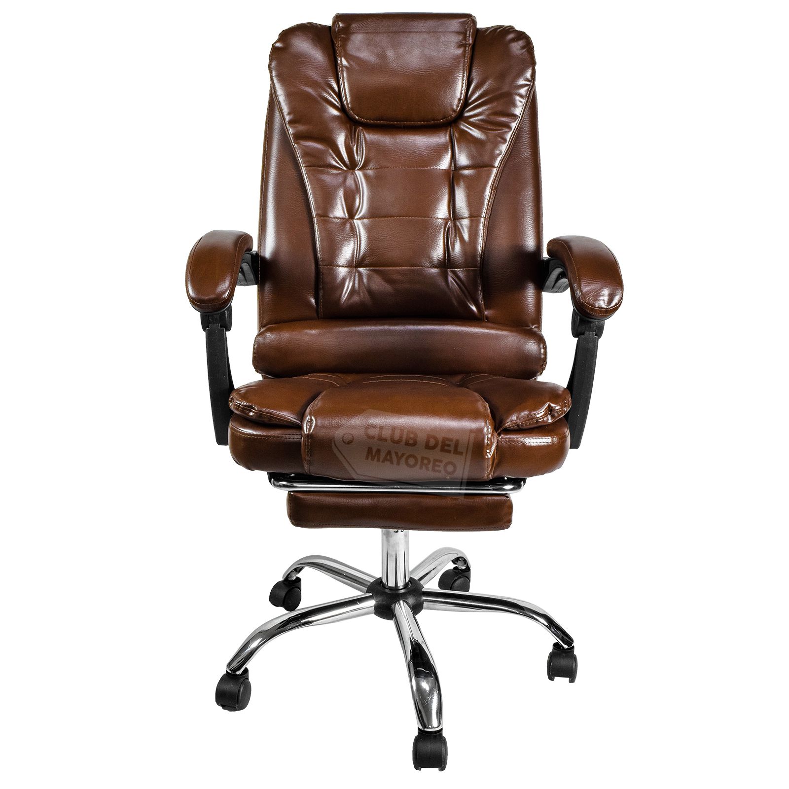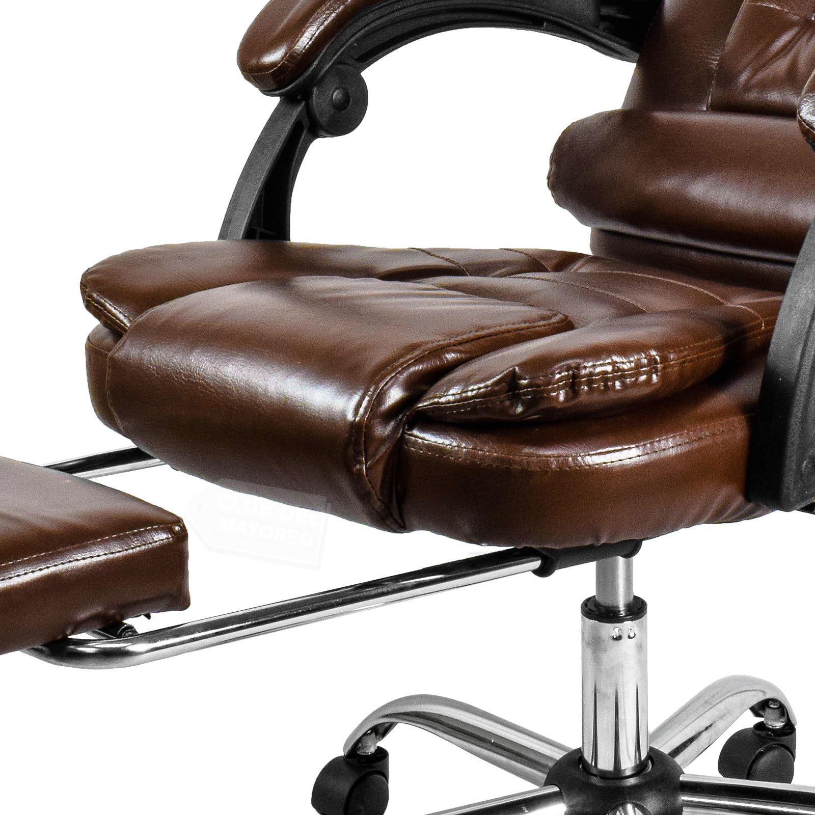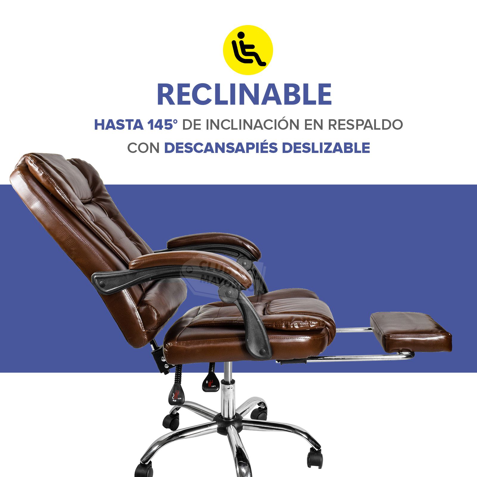 Hermosa silla para oficina modelo ejecutivo con descansa pies integrado que se puede guardar debajo del asiento, se puede reclinar en un ángulo de hasta 145 grados, respaldo y asiento en forro de vinipiel color cafe, respaldo acolchado con soporte en zona lumbar para mayor confort, ruedas silenciosas giratorias independientes cada una, base giratoria en metal tipo cromado, palanca para regular la altura de la silla, brazos en plástico rígido con colchonetas superiores. La silla puede soportar un peso máximo de 150 Kg.