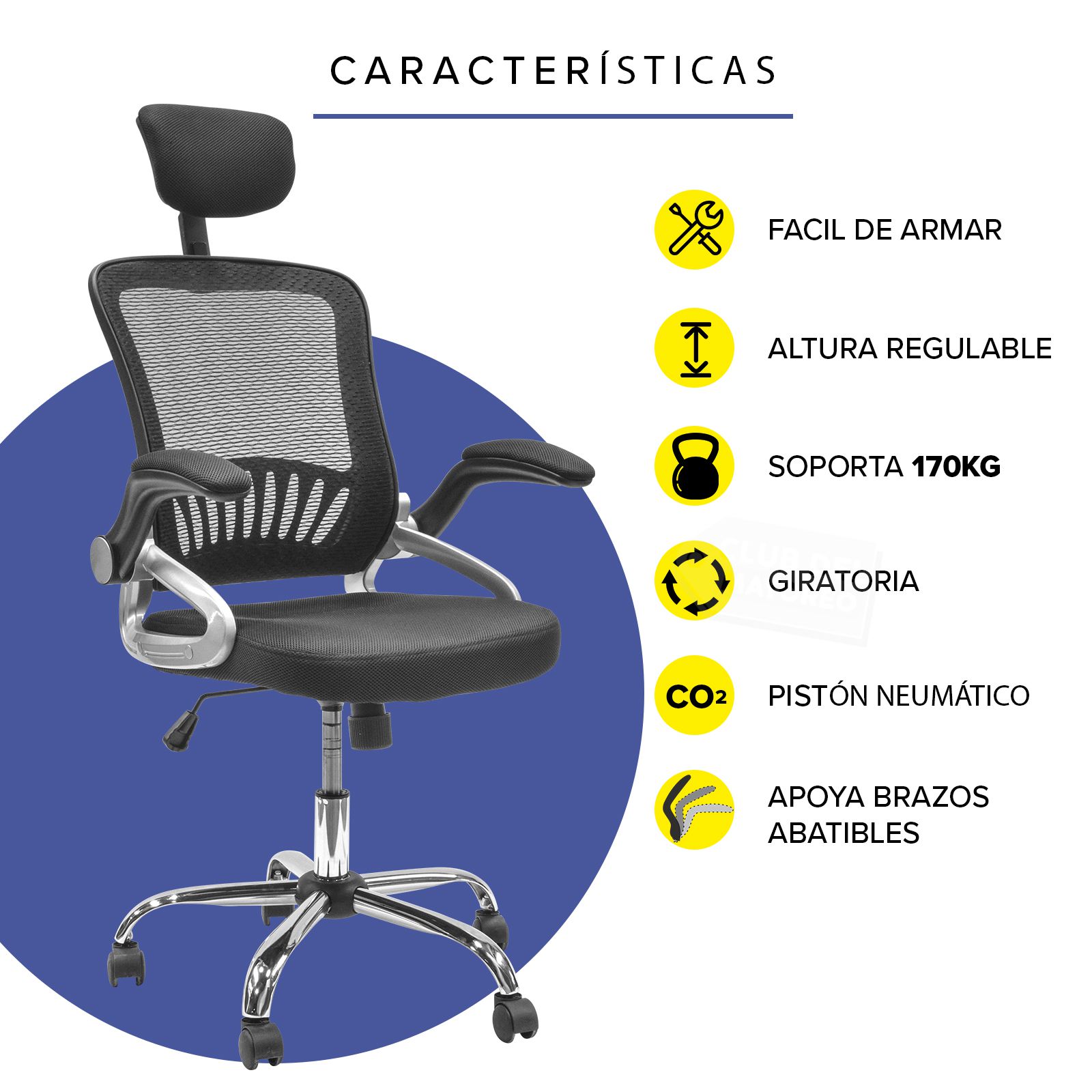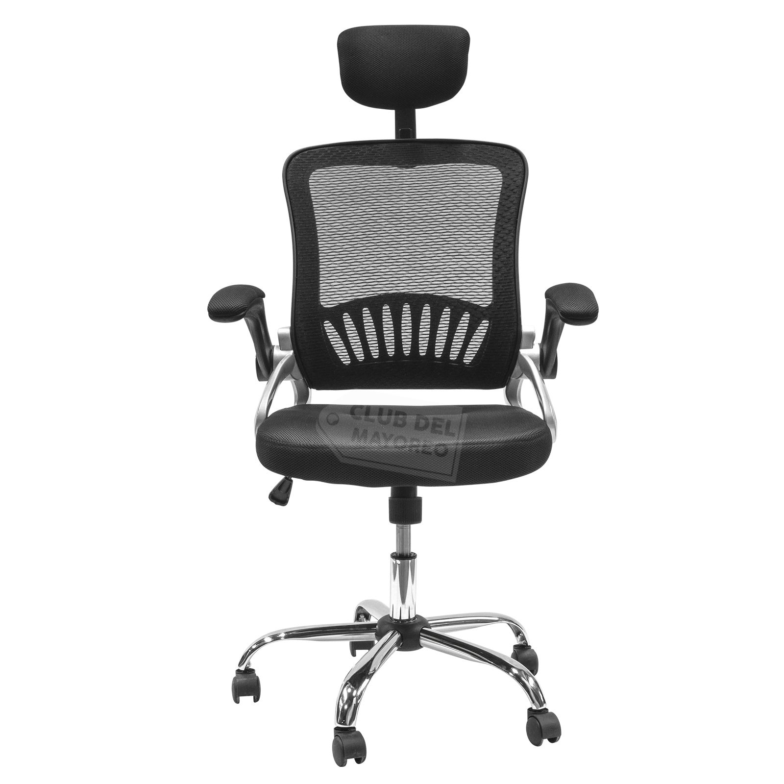 Silla de oficina estilo gerencial con cabecera de buena calidad en acabados y materiales. Cuenta con cabecera ajustable en altura y posición de cabeza. Sus brazos se puede abatir. Función de ajustar la altura deseada para trabajar. Forrada en malla para el respaldo y en asiento, evita la transpiración, su base giratoria es giratoria y acabado en cromado con ruedas suaves con giro independiente cada una. La silla puede soportar un peso máximo de hasta 170 Kg.