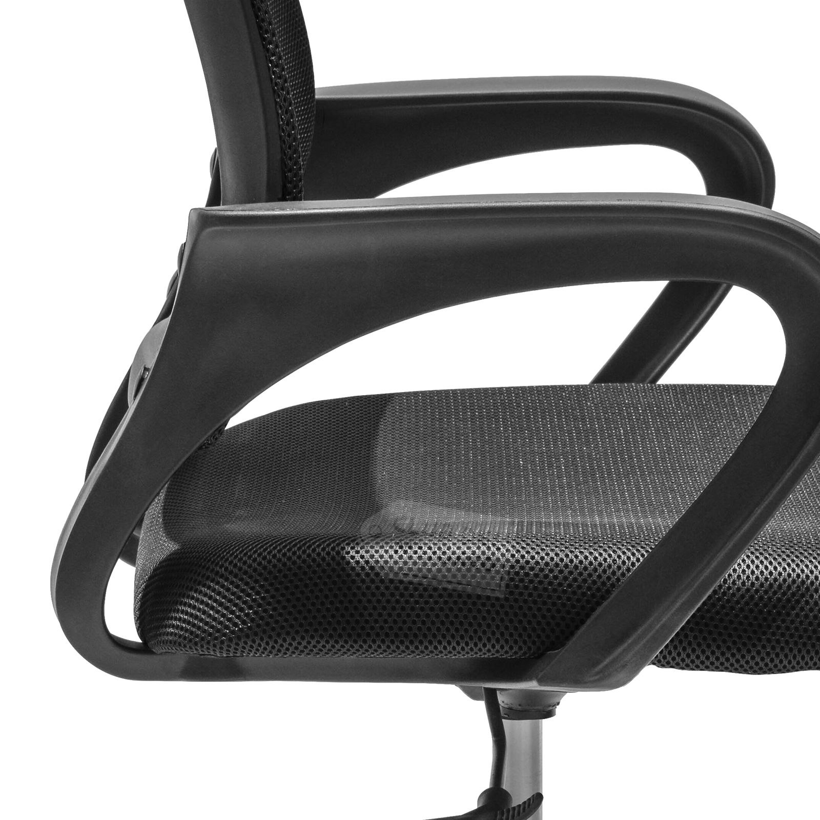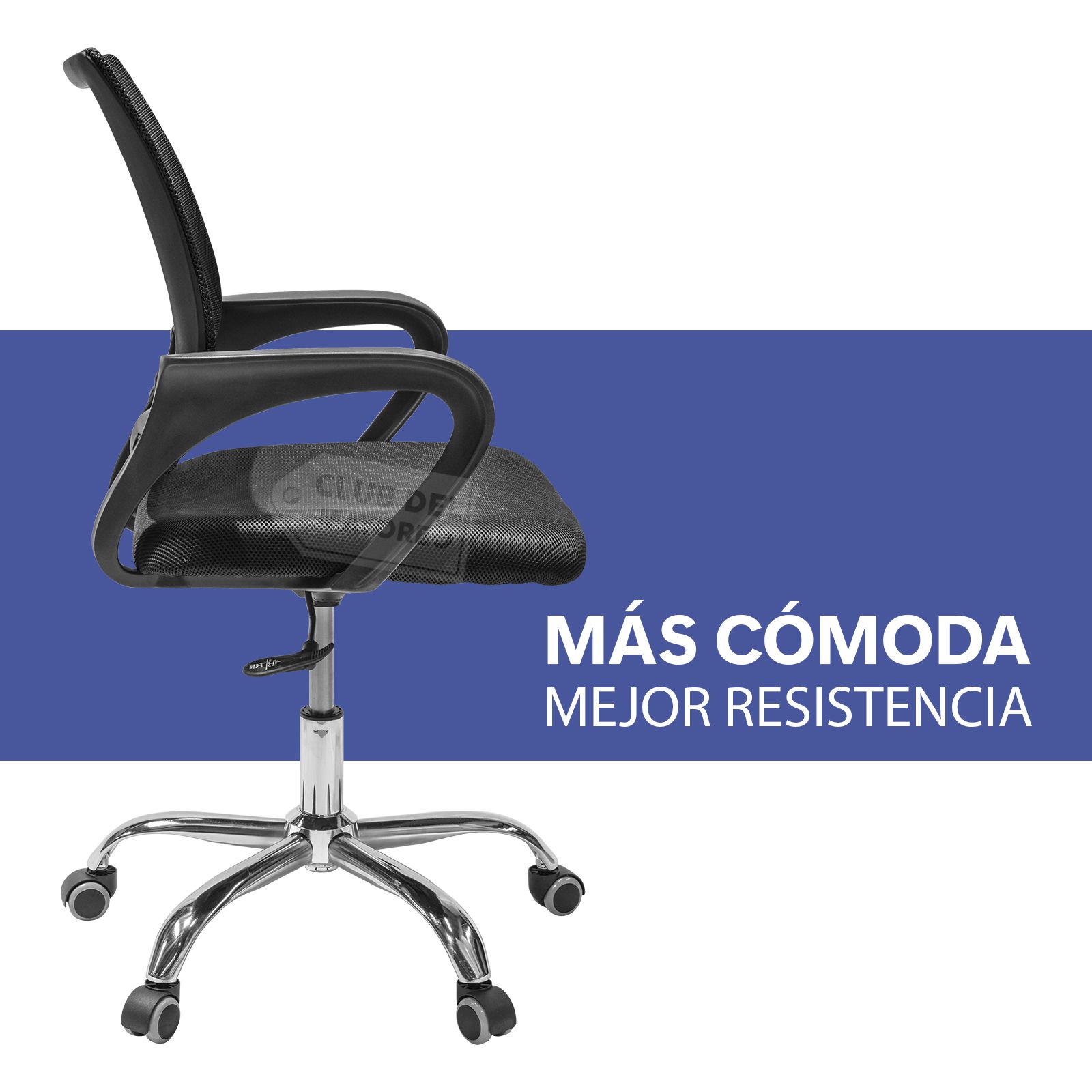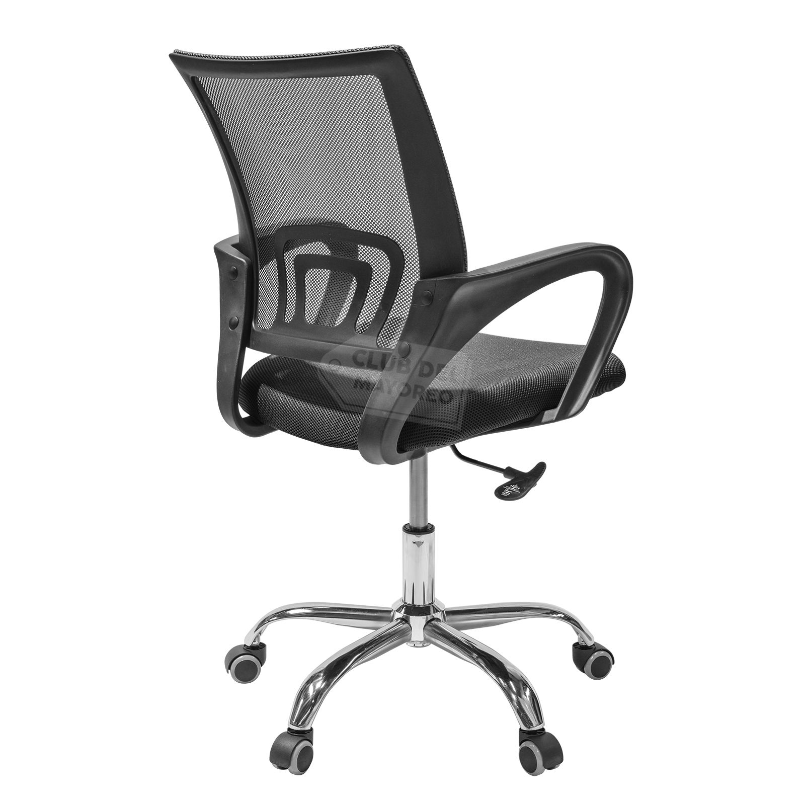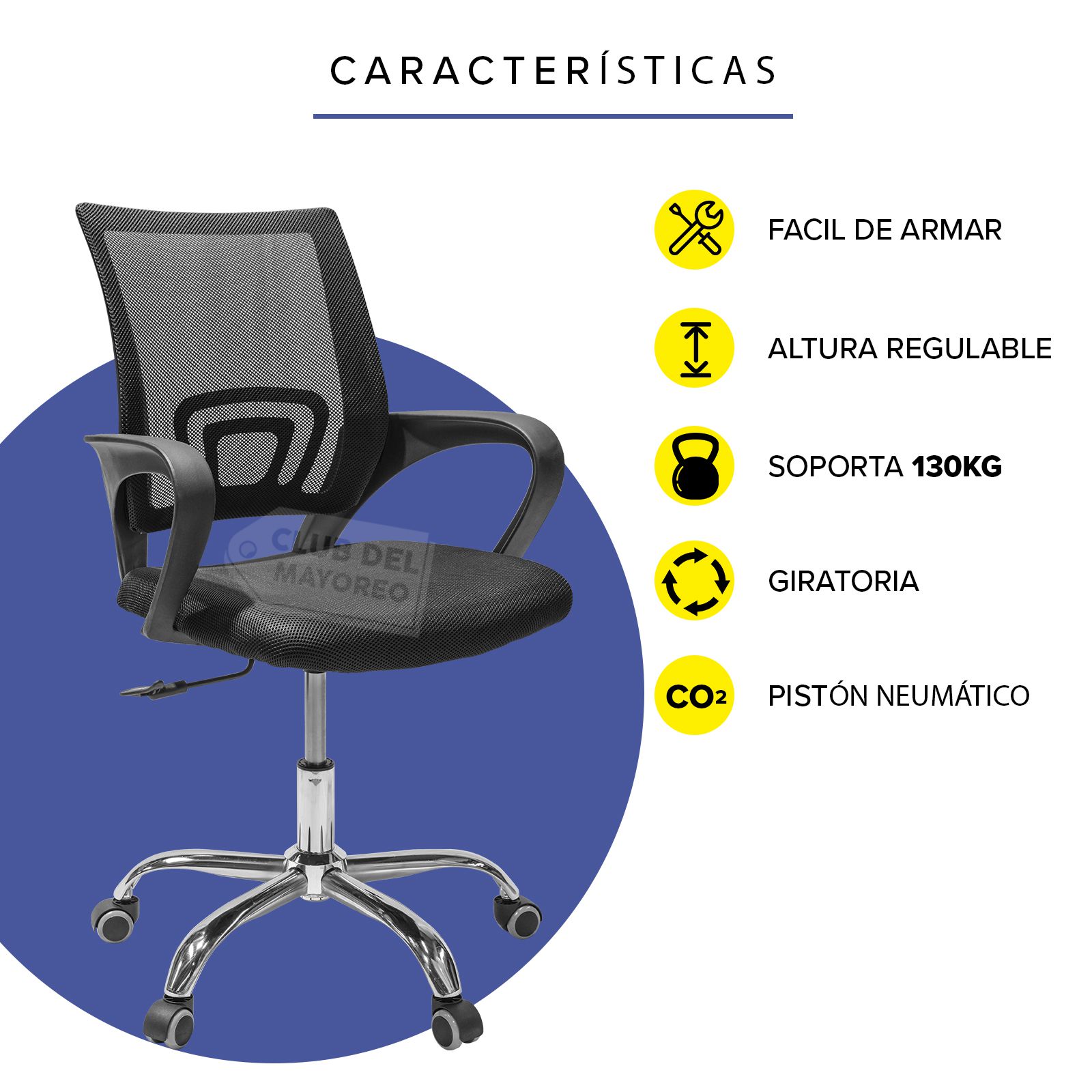 Silla ergonómica para oficina modelo secretarial con respaldo y asiento en malla antitranspirante, respaldo suave para mejor confort, ruedas silenciosas giratorias independientes, base giratoria en metalico tipo cromado, palanca para regular la altura de la silla, brazos en plástico rígido y resistente. La silla puede soportar un peso máximo de 130 Kg.