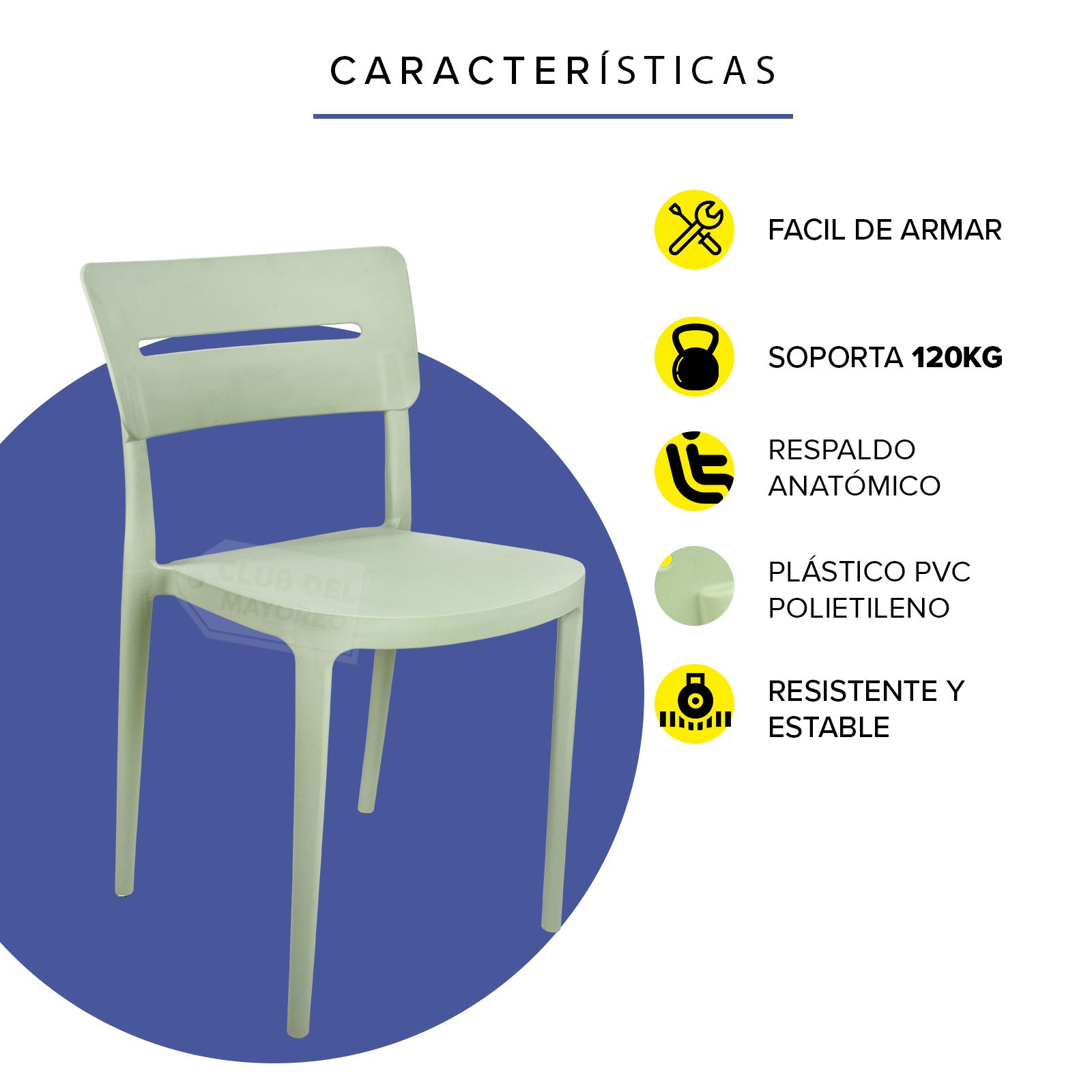 Silla práctica, funcional y ligera ideal para exteriores, cafeterías, restaurantes, fondas, jardín, patio, etc. Fabricadas en resistente plástico tipo polipropileno para convertirlas en sillas ligeras para fácil transporte. Estructura color verde pistache mate de polietileno para mayor confort y durabilidad ante cualquier clima exterior. Libre de mantenimiento y fácil de limpiar. Se pueden apilar para ahorrar espacio en el almacenaje. La silla puede soportar un peso de 125 Kgs.