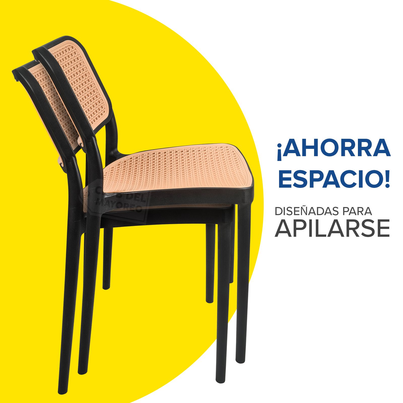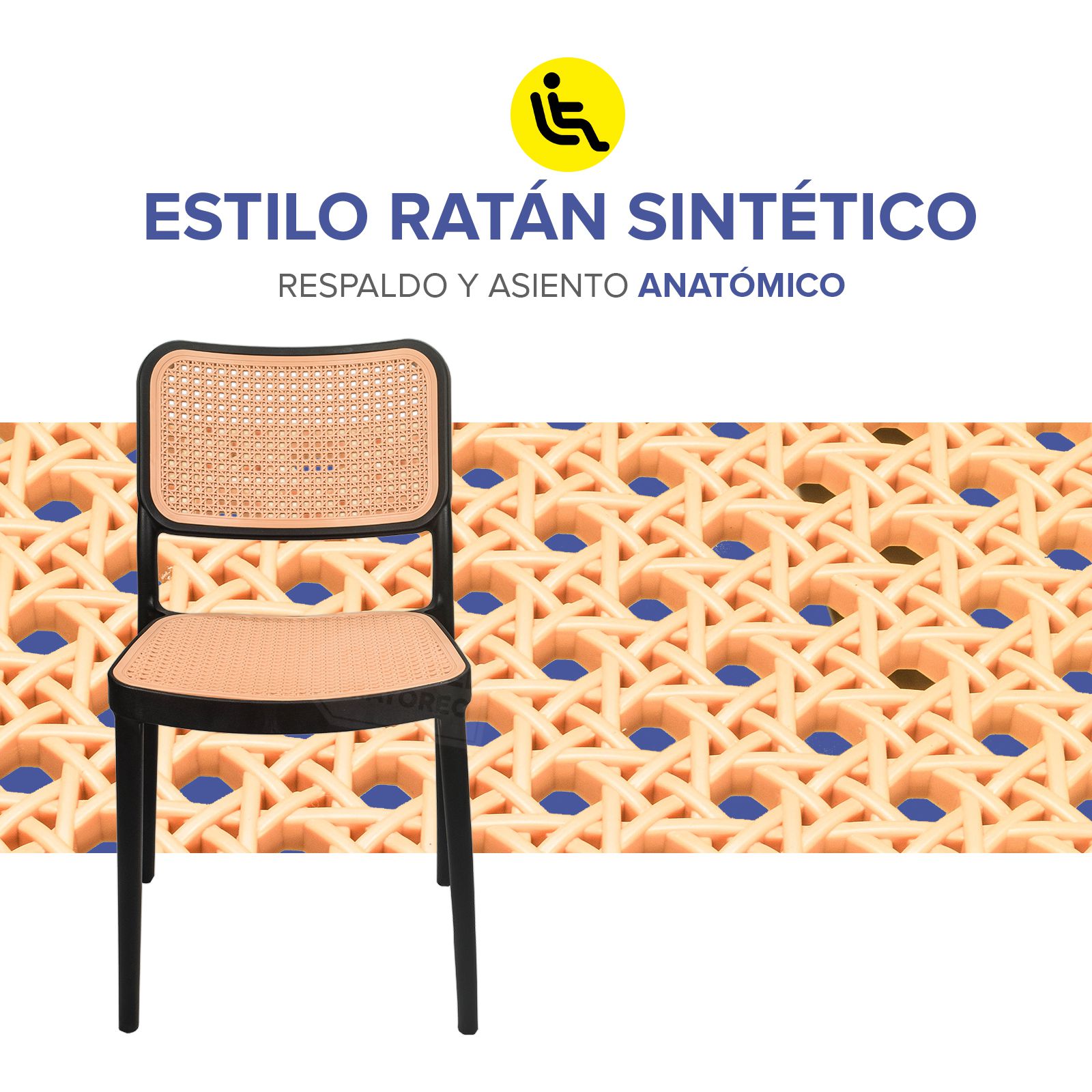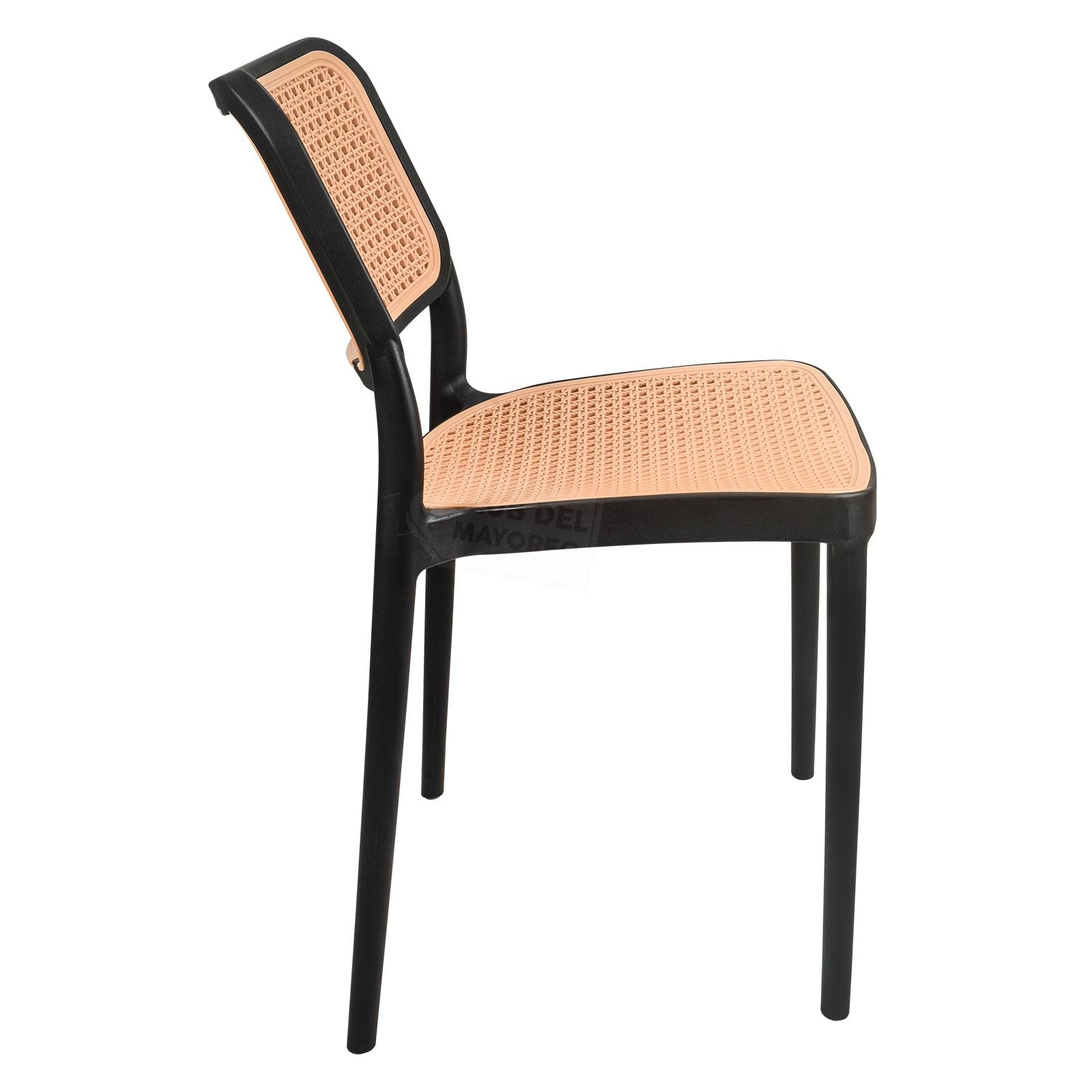Práctica, funcional y ligera silla ideal para exteriores, cafeterías, restaurantes, fondas, jardín, patio, etc. Fabricadas en resistente plástico tipo polipropileno para convertirlas en sillas ligeras para fácil transporte. Estructura color negro mate y rejilla en asiento y respaldo estilo ratán tejido de polietileno color roble natural para mayor confort. Se pueden apilar para ahorrar espacio en el almacenaje. La silla puede soportar un peso de 125 Kgs.