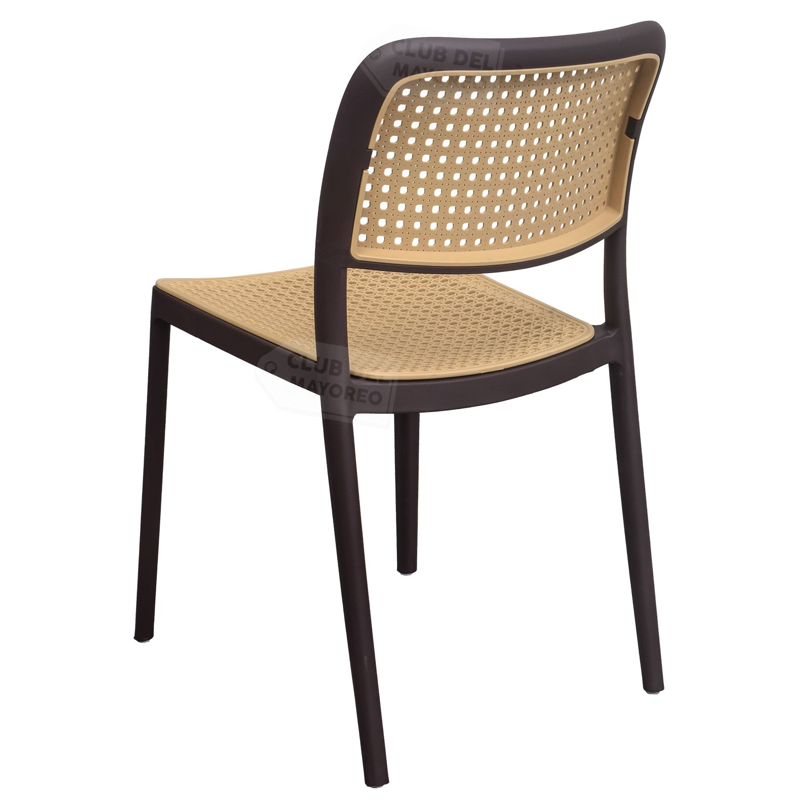 Práctica, funcional y ligera silla ideal para exteriores, cafeterías, restaurantes, fondas, jardín, patio, etc. Fabricadas en resistente plástico tipo polipropileno para convertirlas en sillas ligeras para fácil transporte. Estructura color cafe mate y rejilla en asiento y respaldo estilo ratán tejido de polietileno color roble natural para mayor confort. Se pueden apilar para ahorrar espacio en el almacenaje. La silla puede soportar un peso de 125 Kgs.