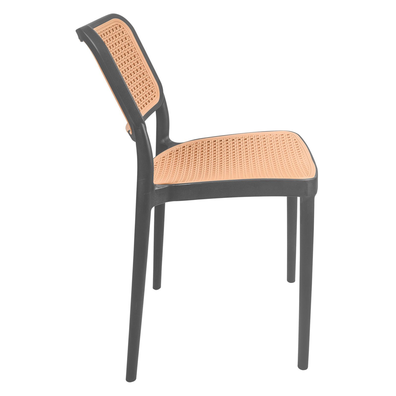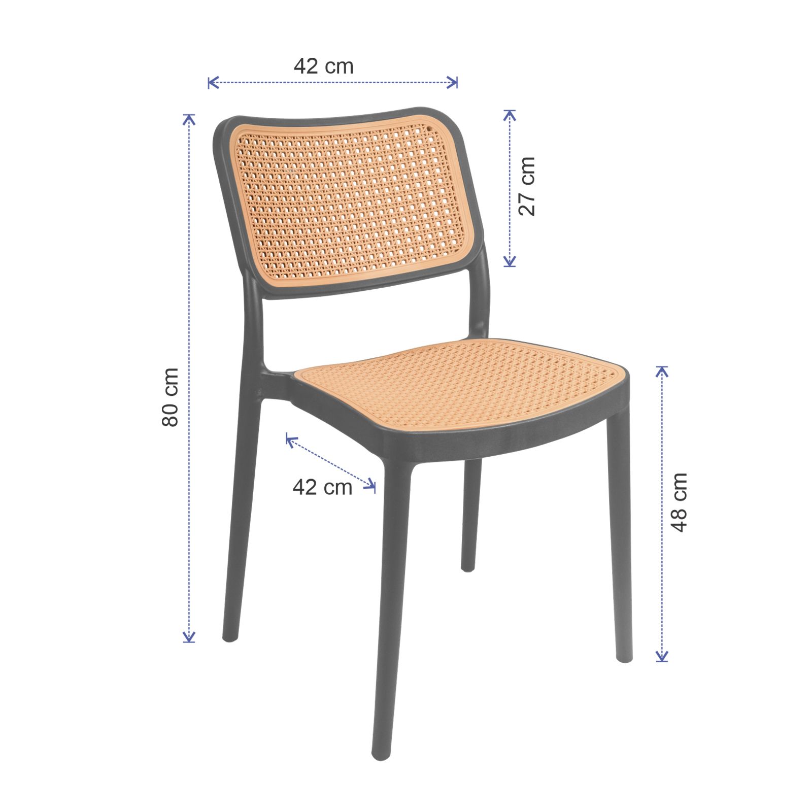 Práctica, funcional y ligera silla ideal para exteriores, cafeterías, restaurantes, fondas, jardín, patio, etc. Fabricadas en resistente plástico tipo polipropileno para convertirlas en sillas ligeras para fácil transporte. Estructura color gris mate y rejilla en asiento y respaldo estilo ratán tejido de polietileno color natural para mayor confort. Se pueden apilar para ahorrar espacio en el almacenaje. La silla puede soportar un peso de 125 Kgs.