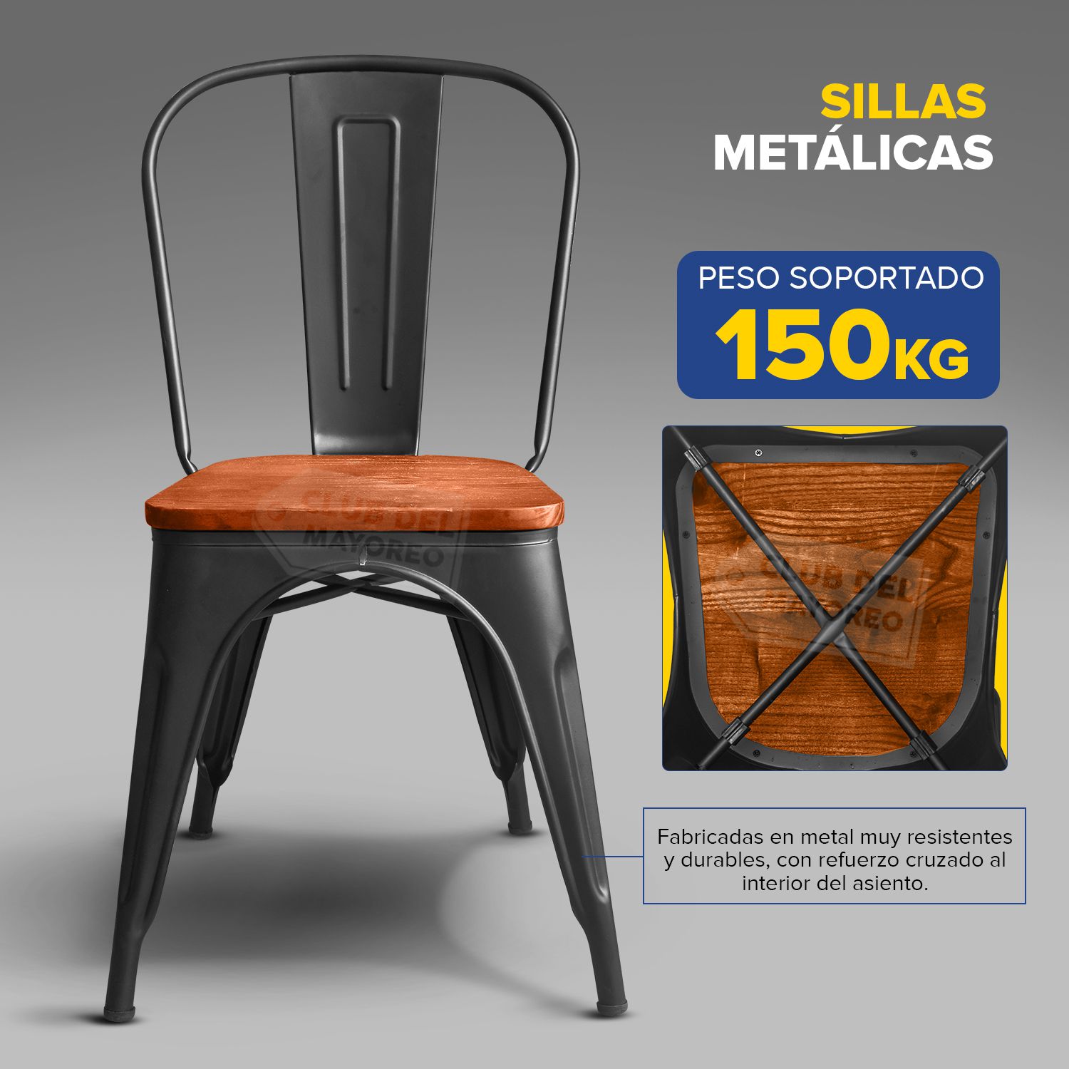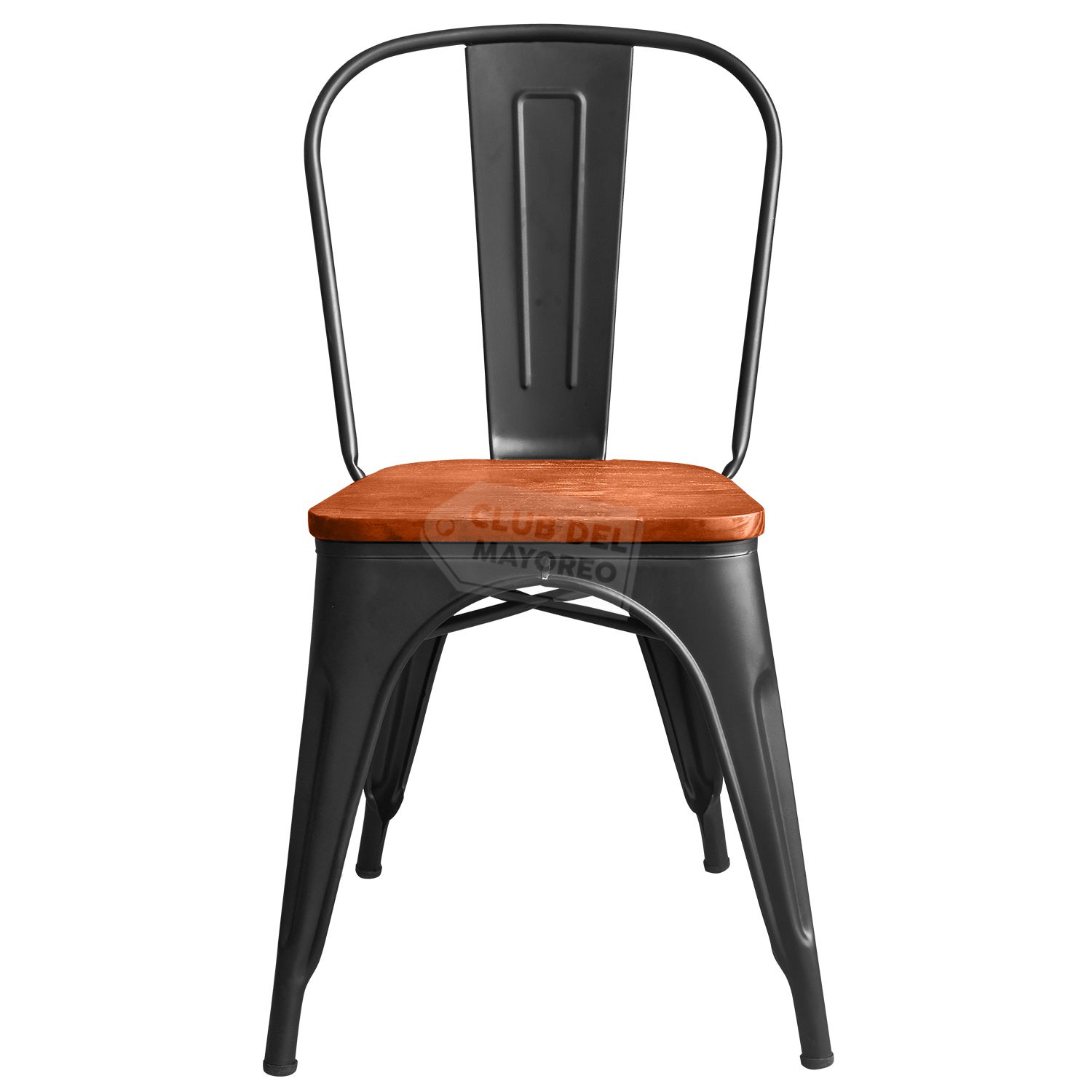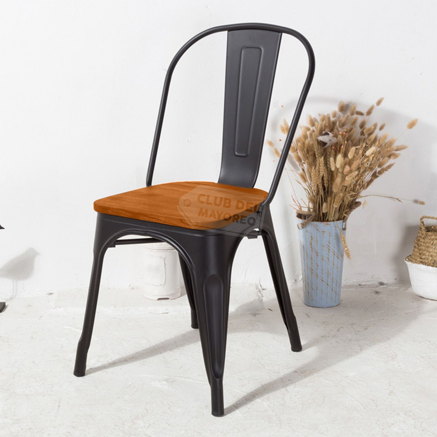 Silla metalica diseño tolix ideal para exteriores, cafeterías, restaurantes, fondas, jardín, patio, etc. Fabricadas en resistente material de metal ligeras para fácil transporte. Estructura color negro mate con asiento comodo en madera y respaldo anatómico curvo para mayor confort. Se pueden apilar para ahorrar espacio en el almacenaje. La silla puede soportar un peso de 150 Kgs.
