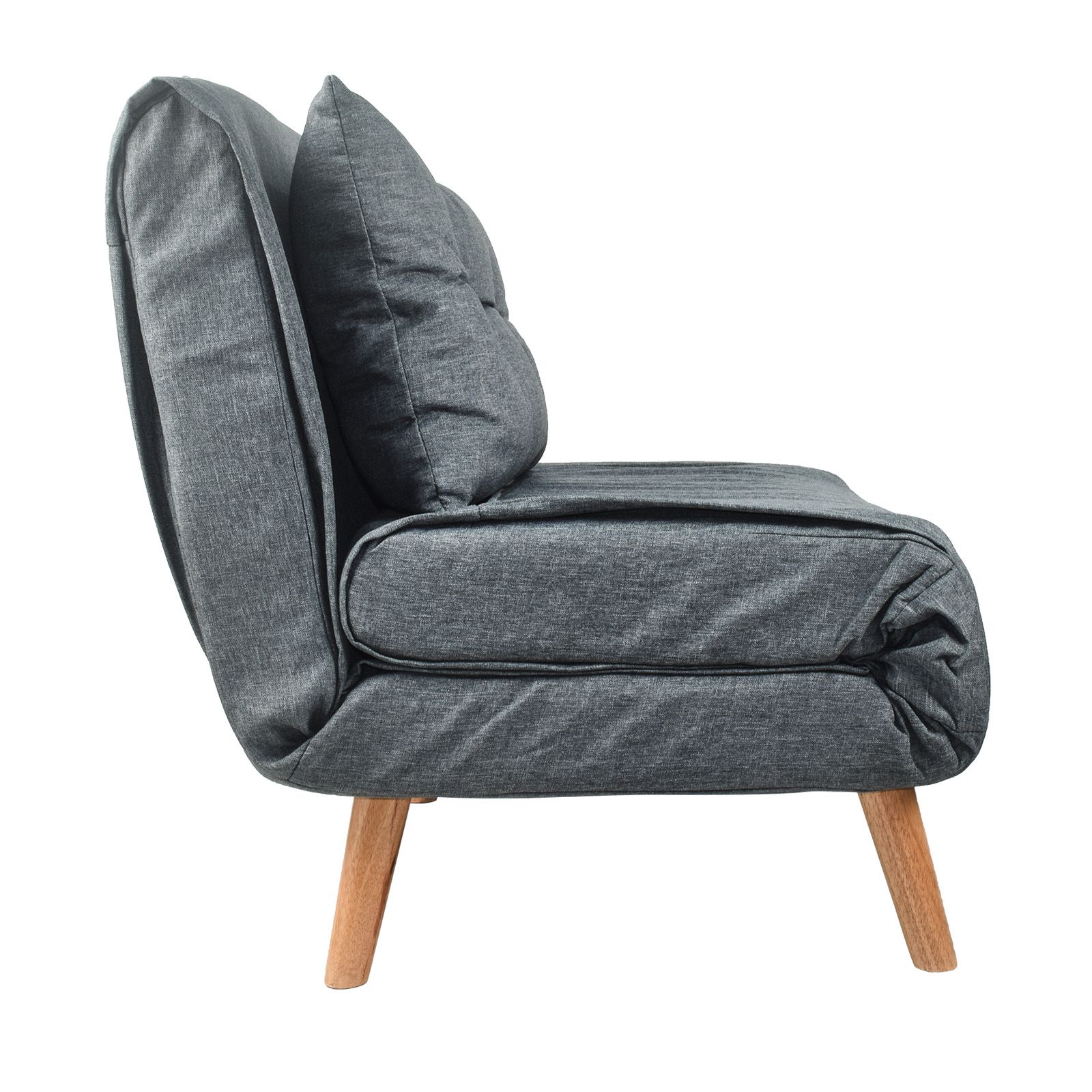 Sillon individual que se puede convertir en cama individual con solo desplegarse en 3 pasos. Forro en tela suave de lino color gris y relleno en esponja y foam moldeable. Cojin incluido para servir como almohada. Fabricado en estructura de madera y patas solidas en madera natural. Puede soportar un peso de 130 kg de manera uniforme.