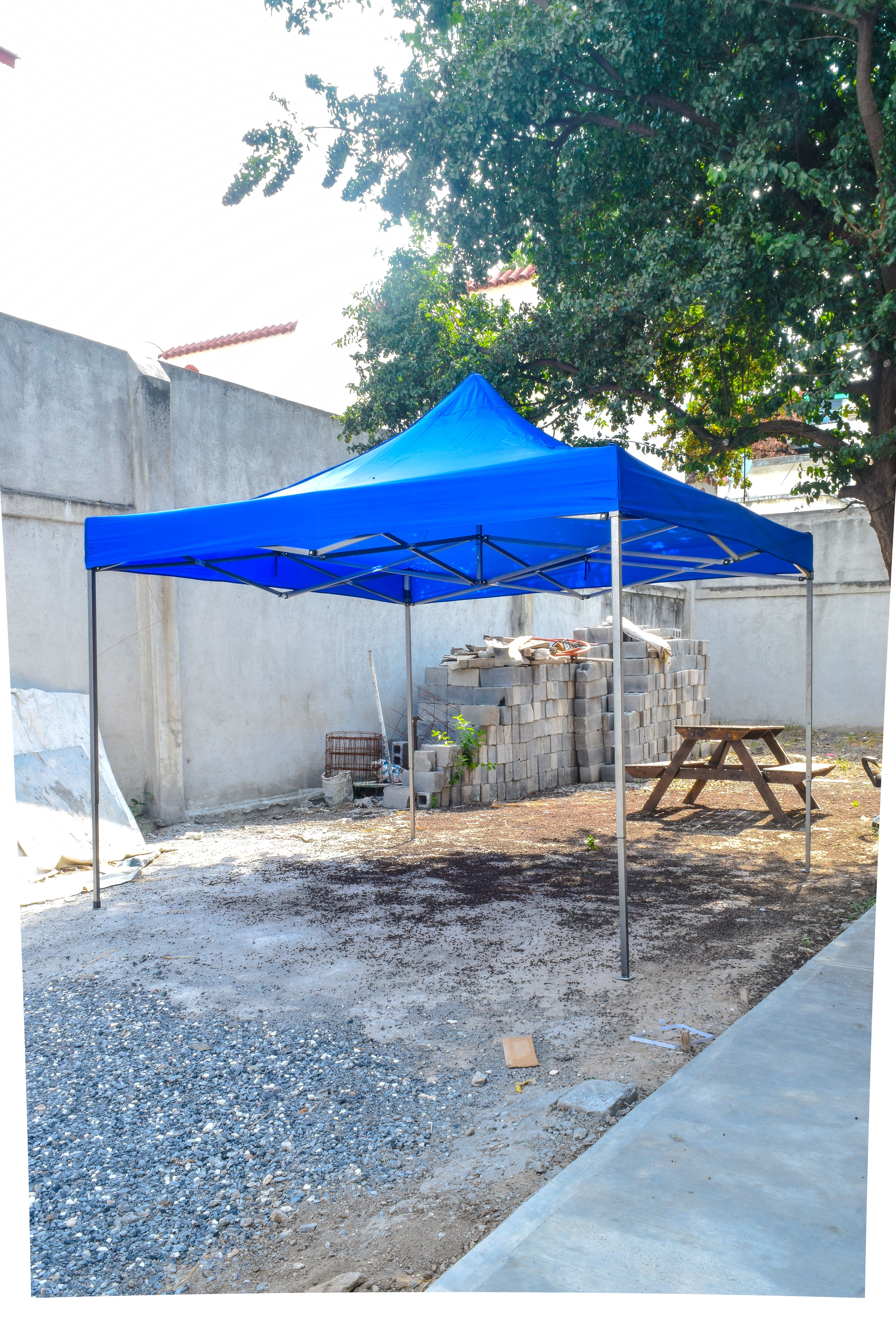 Toldo plegable de 3 x 3 metros con diseño práctico y funcional. Su lona color blanco ofrece una apariencia limpia y elegante, ideal para eventos sociales, exposiciones o jardines.